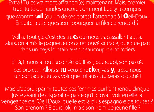C'est cool, on peut vraiment te faire confiance. Alors si tu donnes ton adresse e-mail, tu recevras un message de Lucky lui-même. (important : nous ne conservons aucune adresse, la tienne sera détruite aussitôt utilisée)
